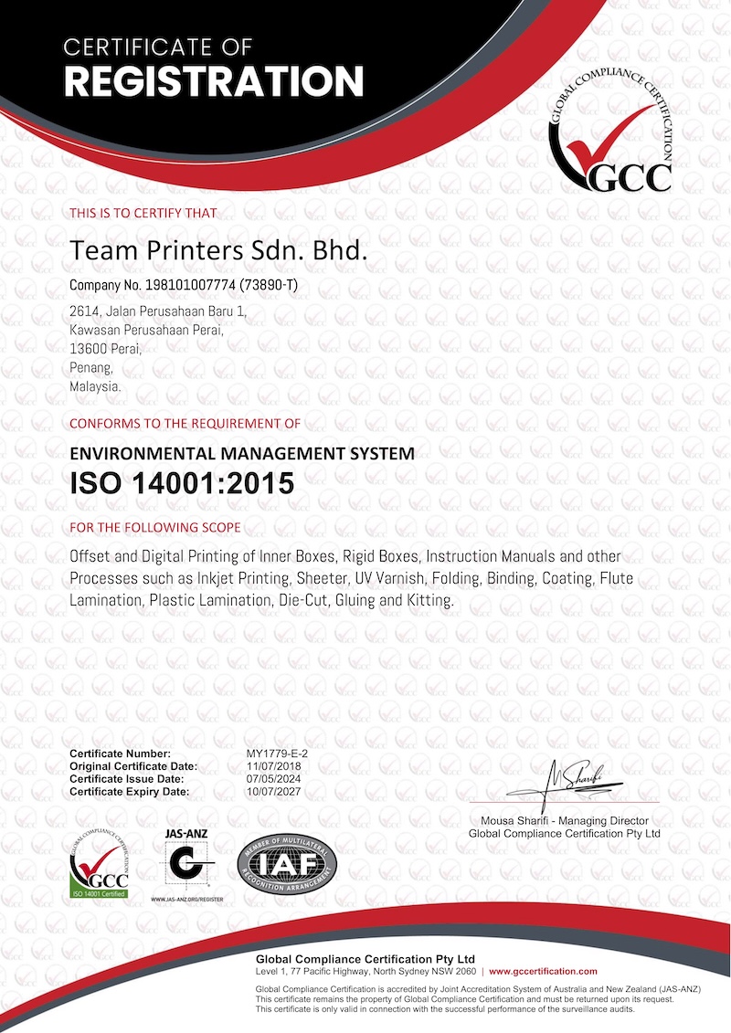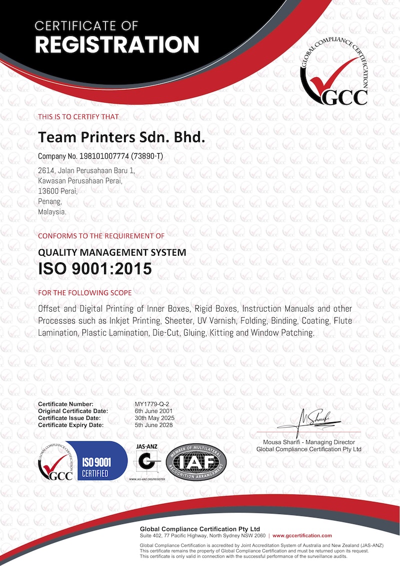 As a reliable packaging printing manufacturer, TeamPrinters is committed to quality and sustainability, holding internationally recognized certifications that demonstrate our compliance with the highest industry standards.